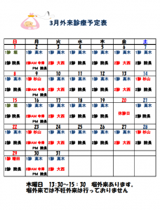 3月外来担当医・休診日カレンダー
